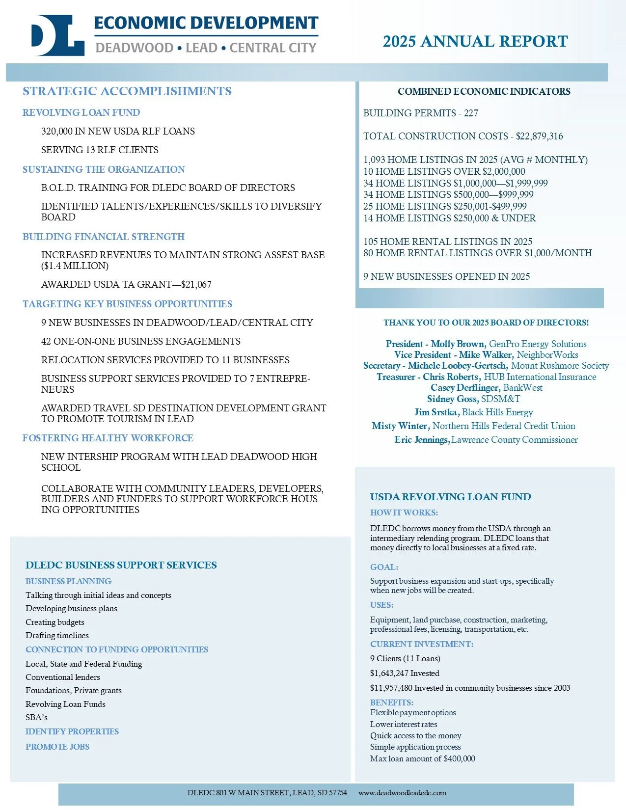 Deadwood Lead Economic Development Corporation established a revolving loan fund with grants provided by the USDA. Loans are intended to create and/or retain jobs through start-up businesses or business expansion. The DLEDC was established in 1989, and since then they have supported approximately 100 businesses, and has invested nearly $15 million.